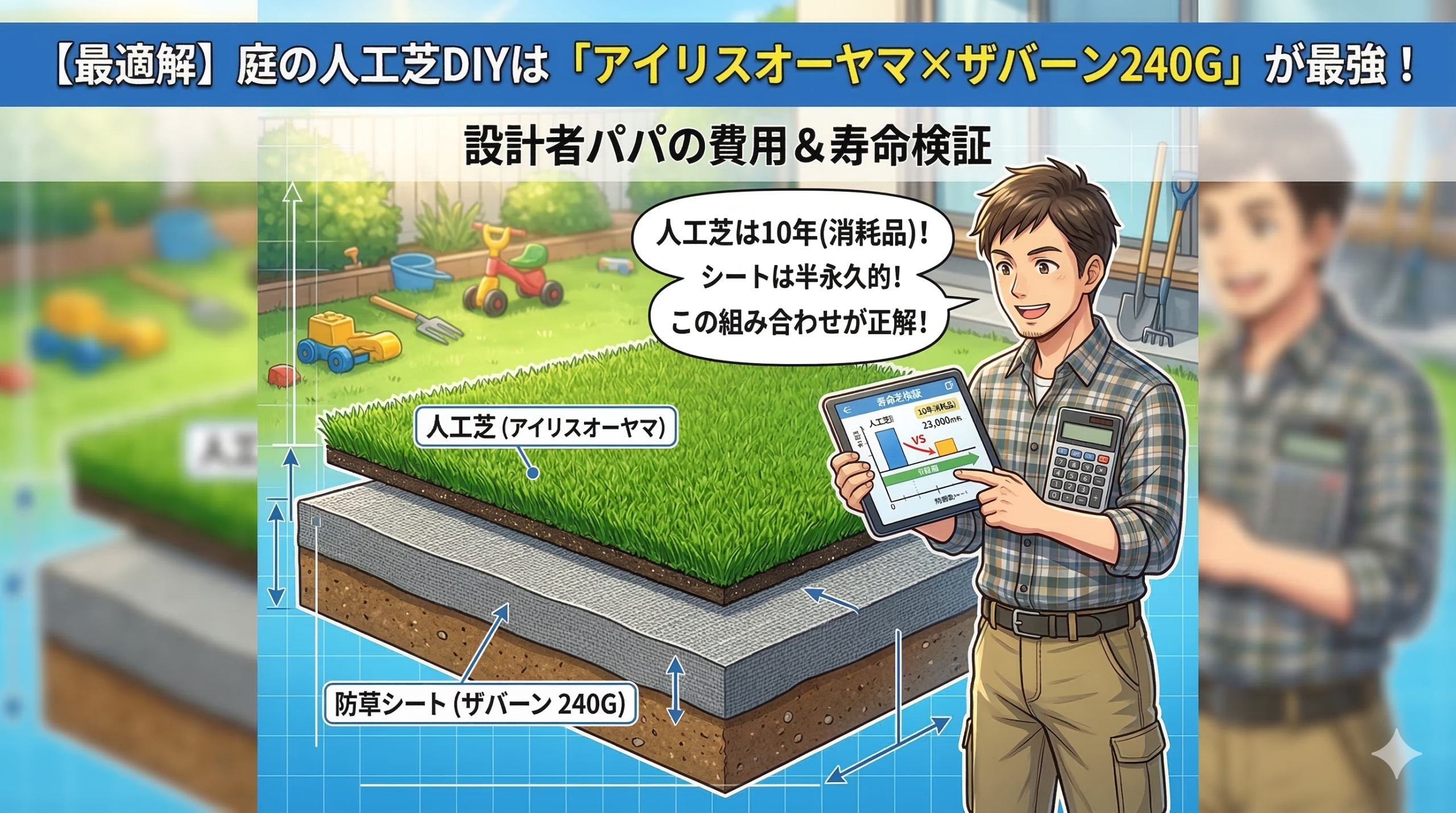 DIYによる節約 【最適解】庭の人工芝DIYは「アイリスオーヤマ×ザバーン240G」が最強!設計者パパの費用と寿命検証