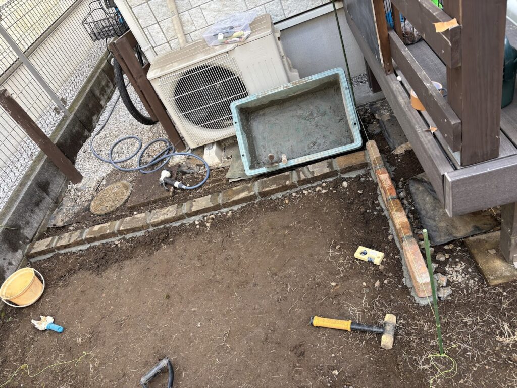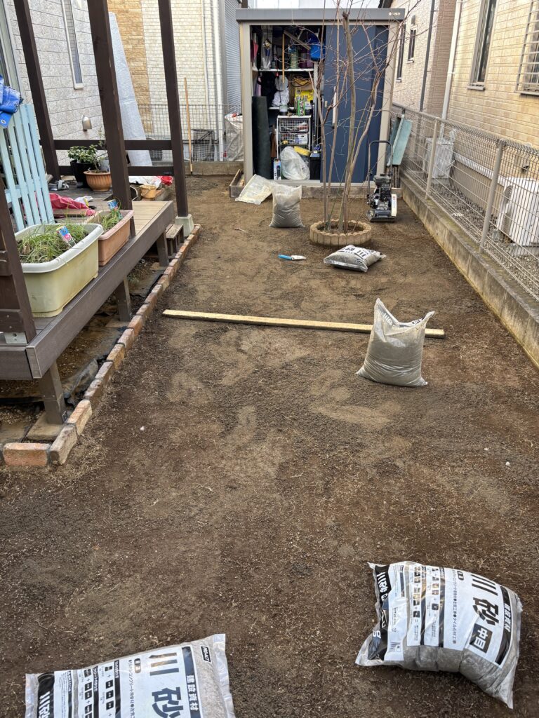 レンガ敷きが終わったら、次は人工芝を敷くための「土壌の均し」です。ここも仕上がりに直結する重要な工程です。