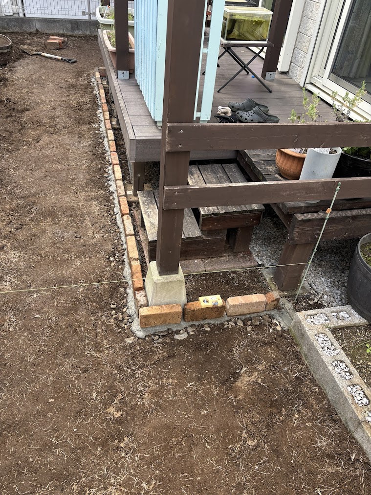 ウッドデッキ横に、境界となるレンガの仕切りを作成しました。