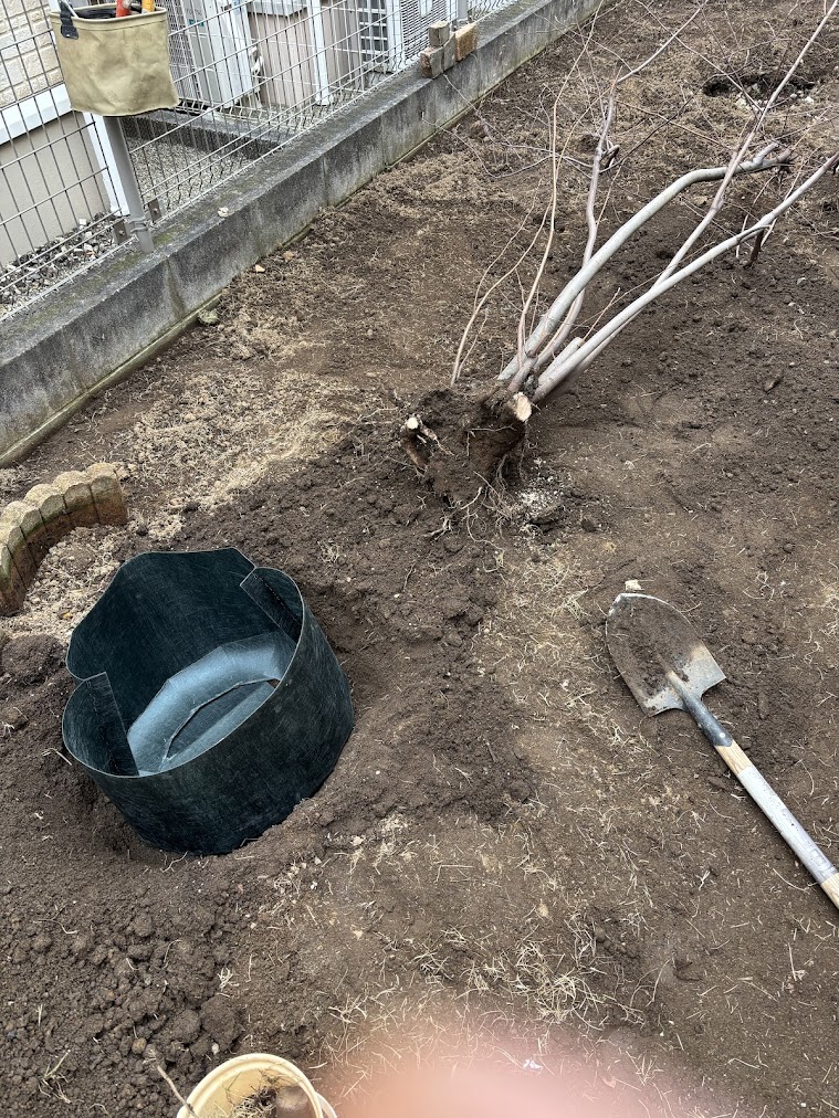 根元を傷つけないようにスコップで慎重に掘り起こし、不織布の鉢で保護して移動。根を乾かさないように注意しながら、新しい場所に植え替えました。不織布鉢があると、根の保護と通気性が両立できるのでおすすめです。