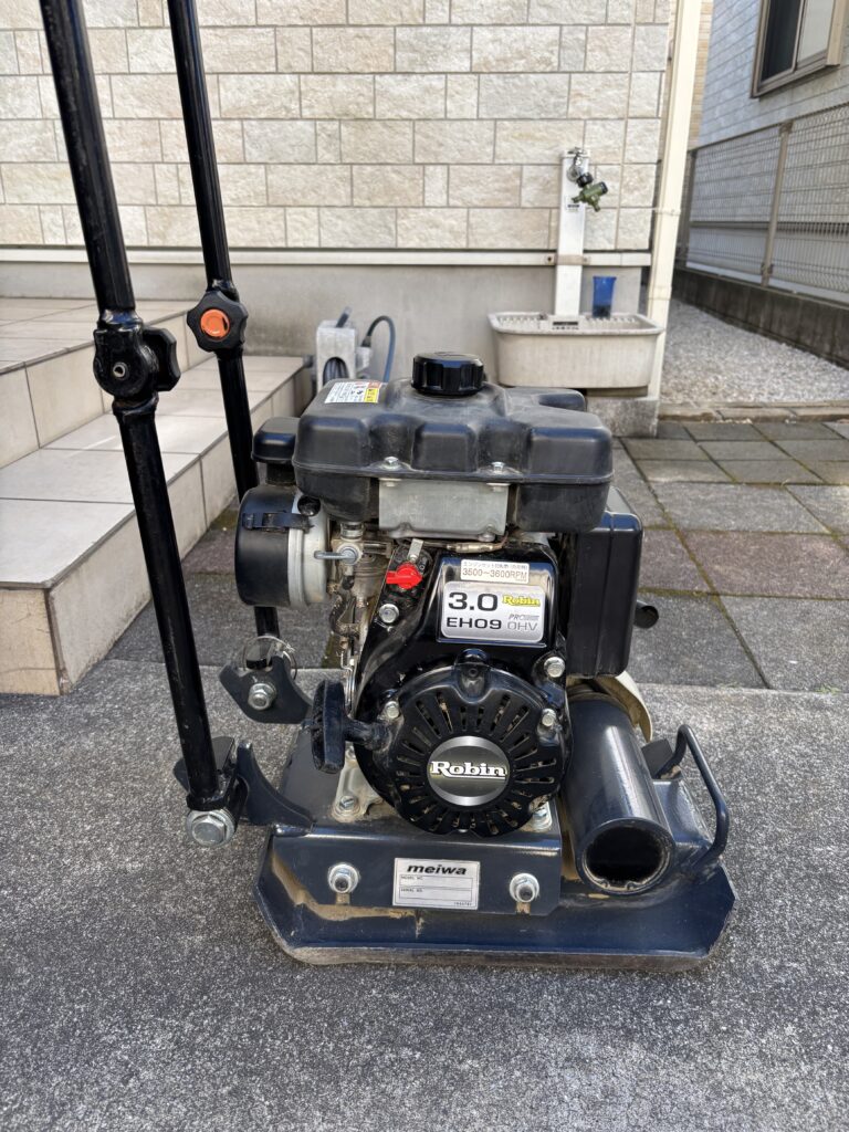 均した土を、プレートコンパクタ(転圧機)で踏み固める工程です。