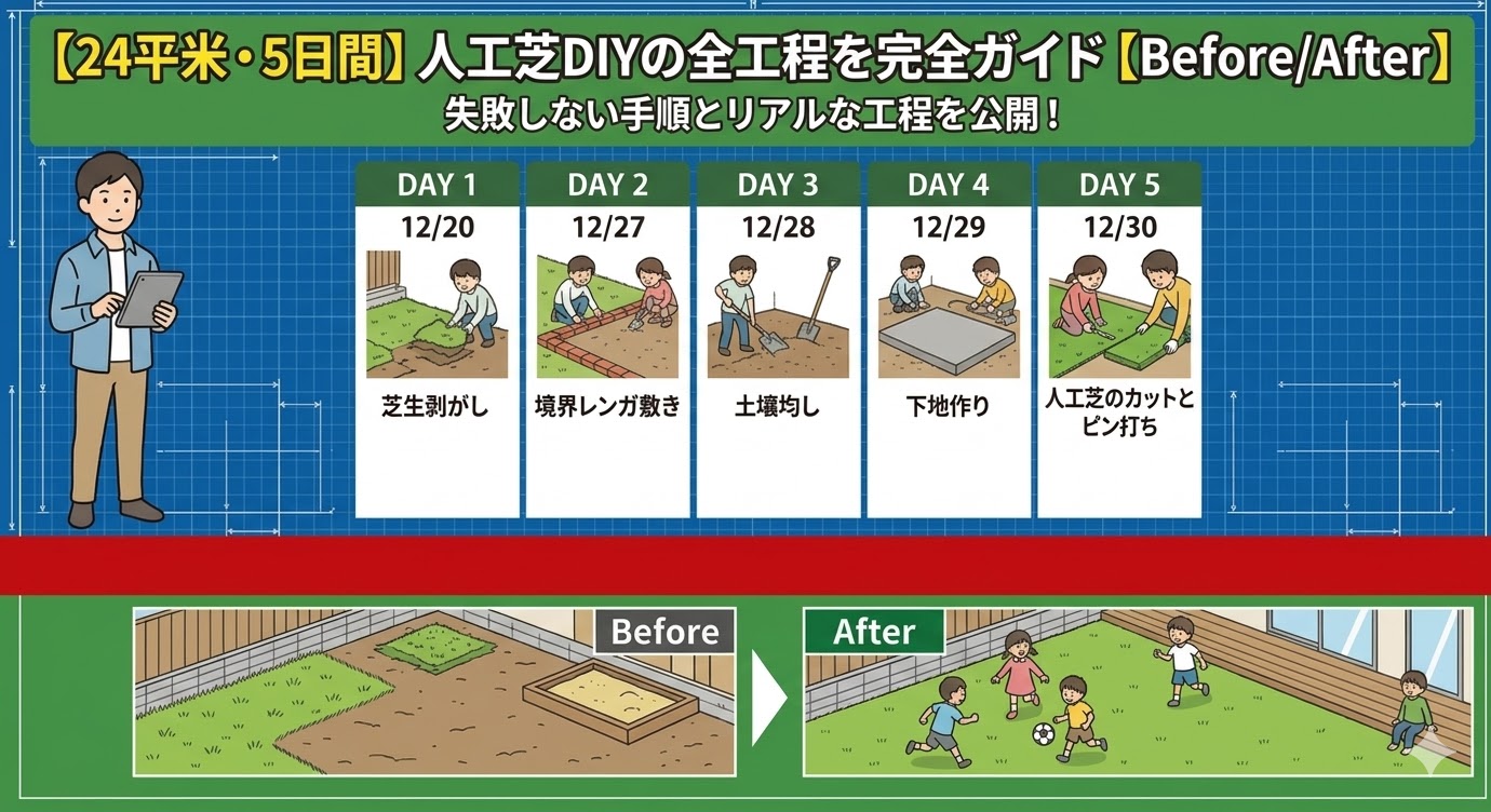 そんな私が、自宅の庭(施工面積は24平米)をモデルケースに、既存の芝生剥がしからレンガ敷き、人工芝の敷設まで、5日間で完結させたリアルな全工程を、写真付きで完全公開します。