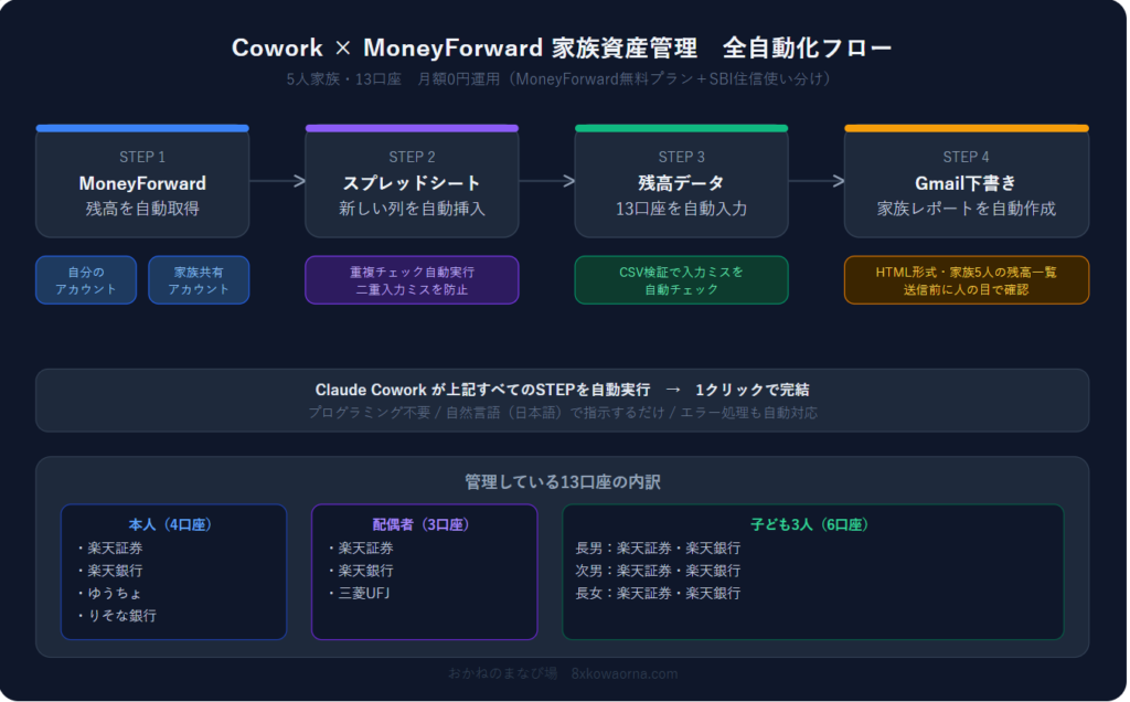 メタディスクリプション:5人家族・13口座の資産管理をCowork(Claude)で完全自動化。MoneyForward無料プラン+SBI住信との使い分けで月額0円を実現しながら、残高自動取得→スプレッドシート記録→Gmail下書きまで1クリックで完結。実際に1週間試行錯誤した全手順を公開。